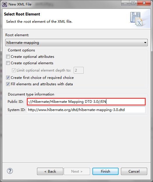在这一步,我们需要手动输入Public ID的值,如图所示:-//Hibernate/Hibernate Mapping DTD 3.0//EN。点击"Finish",我们就会得到我们所需要的一个user.hbm.xml配置文件。内容如下: