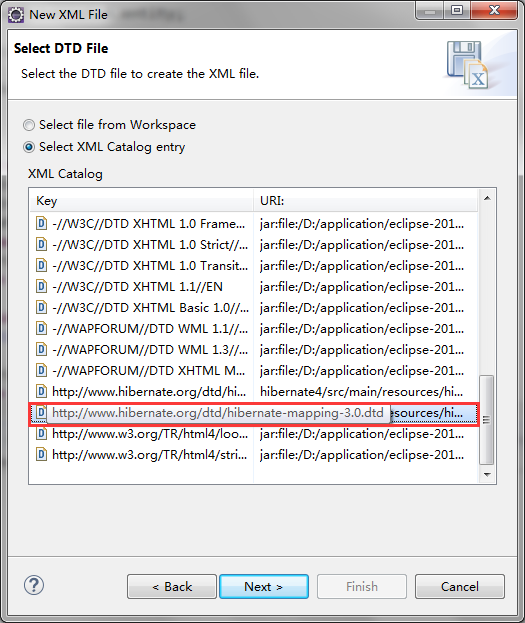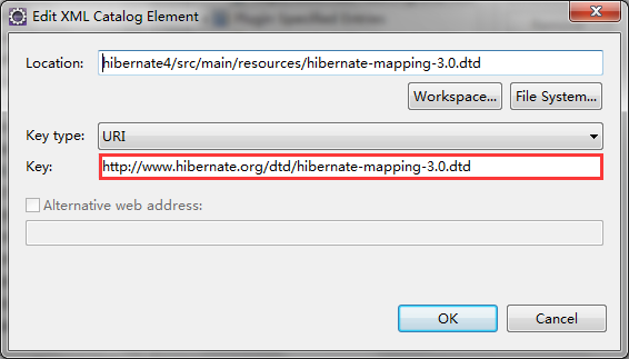 点击Add按钮之后,在弹出框中,选择我们解压出来的hibernate-mapping-3.0.dtd,key type选择:URI,然后key输入:,结束配置。